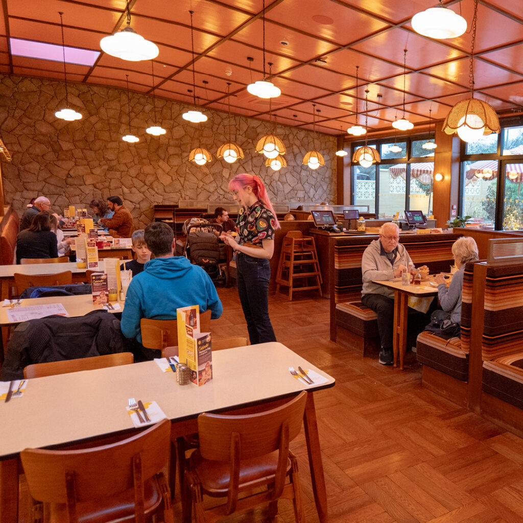 The first thing that strikes you upon arrival is the aesthetic. Brightside Saltash leans heavily into a “cinematic” 1970s and 80s vibe, featuring rich cherry wood panelling, orange-and-brown striped upholstery, and Formica-topped tables. It evokes the golden age of the Great British road trip, providing a sense of comfort that modern, glass-and-steel service hubs lack. For the solo rider or a group of mates out on a Sunday blast, the atmosphere is instantly relaxing—a place where you can actually sit back and decompress from the “white noise” of the road.