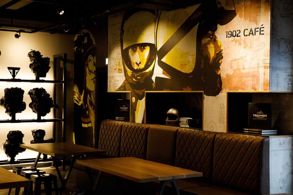 The interior of the Triumph 1902 Café is a masterclass in stylish, biker-focused comfort. One of the most appreciated features is the provision of secure clothing lockers and helmet storage. Every rider knows the struggle of navigating a café while lugging around a heavy helmet and thick leathers; here, you can simply stow your gear away and enjoy your visit unencumbered. The atmosphere is further elevated by the presence of a massive projector screen that regularly broadcasts live racing, ensuring you never miss a second of the MotoGP or British Superbike action while you refuel.
